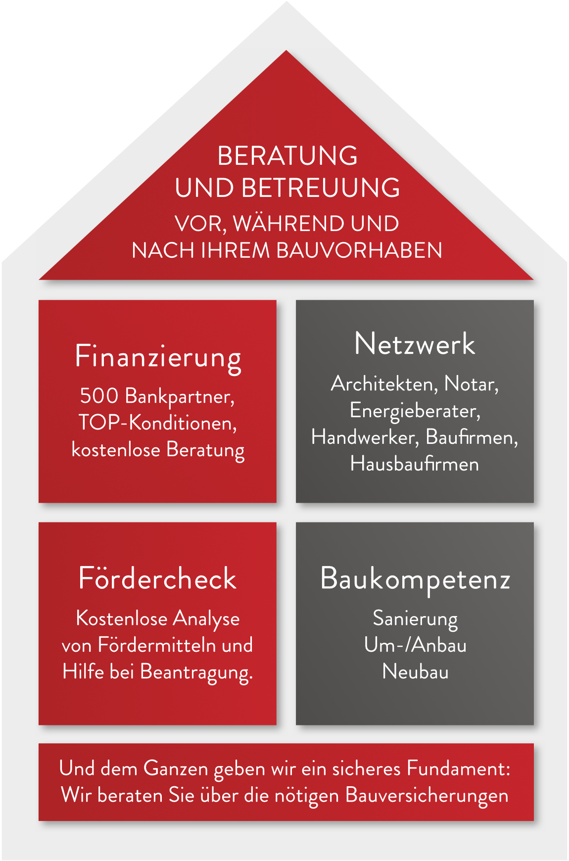 - Wir berechnen, wie viel Haus oder Wohnung Sie sich leisten können und welche Fördermittel für Ihr Vorhaben beantragt werden können.